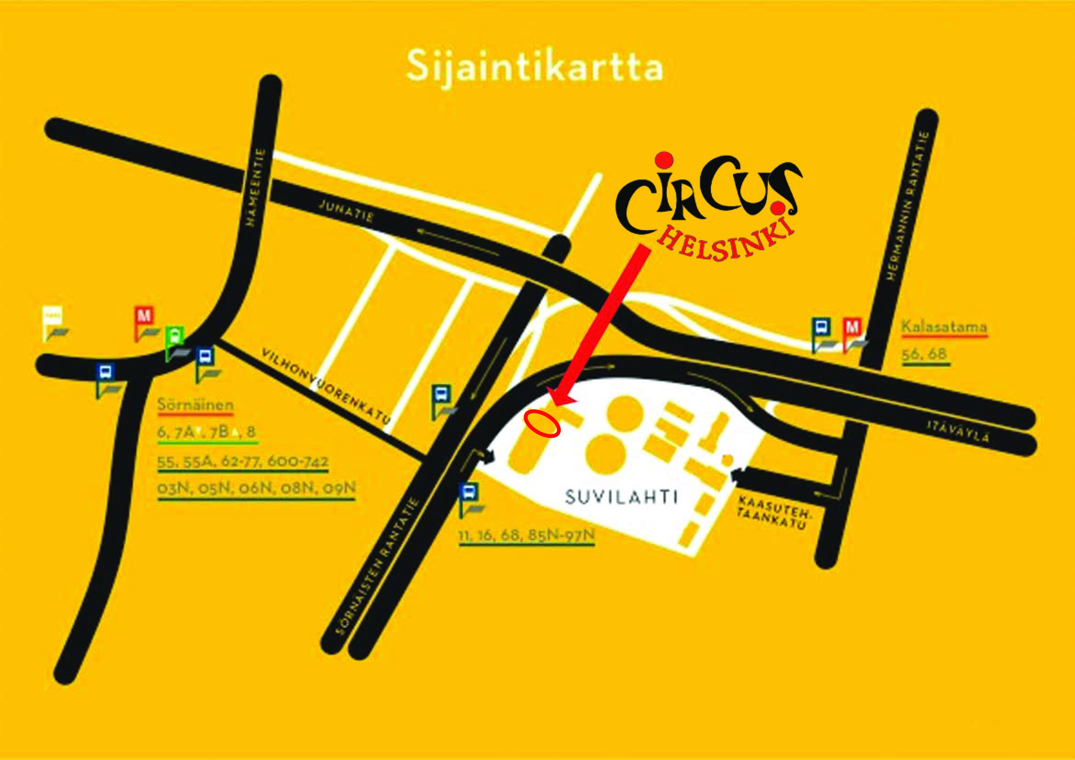Ohjeistamme tapahtumanjärjestäjiä aina Circus Helsingin toiminnasta. Vaikka Suvilahden alue olisi muuten suljettu, Circus Helsingin C-ovelle pääsee kertomalla mahdolliselle järjestyksenvalvojalle Sörnäisten rantatien sisääntuloportilla olevansa tulossa Circus Helsingille.
